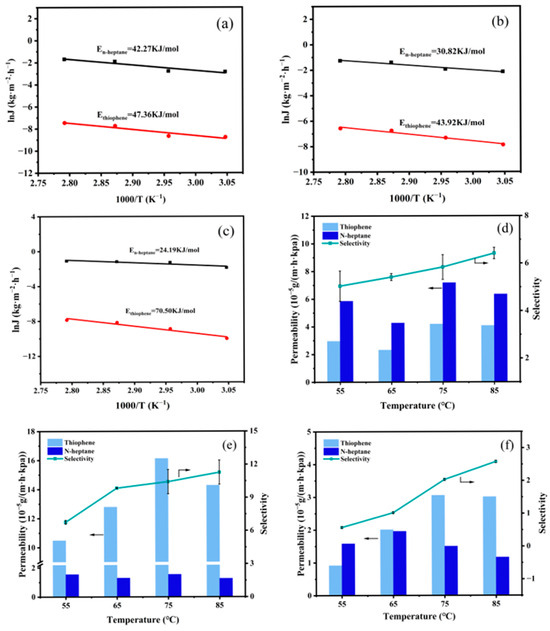 where Ji (kg·m−2·h−1) represents the partial flux of component i, Joi (kg·m−2·h−1) is the permeation flux constant, Ep (kJ·mol−1) represents the apparent activation energy, R (J·mol−1·K−1) represents the gas molar constant, and T (°C) denotes the feed temperature. The calculated Ep of thiophene surpasses that of n-heptane, as depicted in Figure 10a–c. A higher Ep indicates greater sensitivity to temperature variations and a more pronounced impact of temperature [30]. Consequently, as the temperature increases, the mass transfer rate of thiophene across the membrane surpasses that of n-heptane, resulting in an increase in the sulfur enrichment factor of the membrane. At this point, the pervaporation process is controlled by the dissolution process. The trends in membrane permeability and selectivity are illustrated in Figure 10d–f. With increasing temperature, the permeability of thiophene either remains stable or slightly increases, while the permeability of n-heptane decreases. The trend in selectivity aligns with the sulfur enrichment factor.