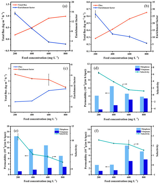 Influence of feed concentration on membrane performance. (a–c). Total flux and sulfur enrichment factor, (d–f) permeability and selectivity, (a,d) PTFEP/PVDF, (b,e) PTFBP/PVDF, and (c,f) POFPP/PVDF.