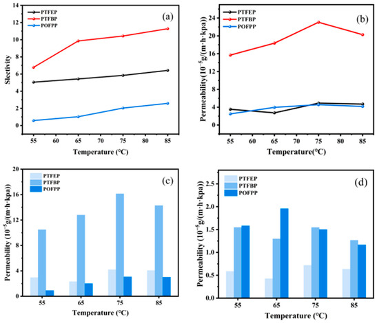 The separation performance of various membranes was compared at a constant thiophene feed concentration of 200 ppm, as shown in Figure 12. The results in Figure 12a,b indicate that the membranes exhibit the following trend in terms of selectivity and total permeability: POFPP < PTFEP < PTFBP. Figure 12c illustrates that the thiophene permeability follows the order: POFPP < PTFEP < PTFBP, aligning with the observed selectivity trend. Subsequently, in Figure 12d, the n-heptane permeability displays the trend PTFEP < PTFBP < POFPP. Notably, the n-heptane permeability of POFPP conforms to the selectivity trend, while that of PTFEP and PTFBP deviates from the expected trend, albeit marginally. All things considered, the total permeability of thiophene and n-heptane demonstrates general consistency with the selectivity trend.