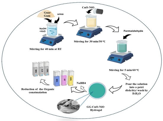 The GG solution was prepared by dissolving 1.5 g of GG powder with 3.5 g of NaOH and 6 g of urea in 50 mL of distilled water and stirring for 40 min. Then, 60 mg of CuO-NiO nanocomposite was added to the GG solution with complete stirring for 30 min. Finally, 5 mL of formaldehyde was added to the mixture with stirring for 5 min under 60 °C, and then the mixtures were poured into a Petri dish. The resulting GG-CuO-NiO hydrogel was gently rinsed three times with distilled water to remove the excess reactants, as shown in Figure 1.