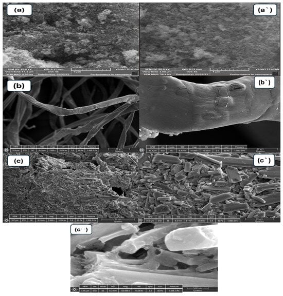 SEM images (a,a`) CuO−NiO, (b,b`)GG hydrogel, and (c,c`,c``) GG−CuO−NiO hydrogel.