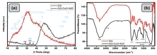 (a) XRD pattern of the nanocomposites, (b) FT-IR images for prepared materials GG and GG−CuO−NiO hydrogel.