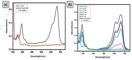 The catalytic activity of the GG-CuO-NiO hydrogel, in breaking down various types of dyes, like Methylene Blue (MB), which is a cationic dye, was chosen as a model compound for this study. An aqueous solution of MB that exhibits a shoulder at 614 nm and an absorbance peak at 664 nm was employed. It was previously found that the n → π* transition of MB is associated with the primary absorbance peak at 664 nm [,]. Plotting the absorbance peak at 664 and 614 nm against time allows one to assess the rate of the MB reduction reaction. A range of MB concentrations, NaBH4 concentrations, and GG-CuO-NiO hydrogel amount were used in the reduction tests to maximize the ideal circumstances for high catalytic activity. Initially, the catalytic reduction of MB dye was studied in the absence of NaBH4, and no noticeable reaction was observed even after 1 h. Subsequently, the reaction was tested in the absence of the GG-CuO-NiO hydrogel, and similarly, no significant reduction occurred, thus demonstrating that both NaBH4 and the catalyst are necessary for the reduction process. Figure 5 illustrates the significant degradation of MB dye with NaBH4 in the presence of the GG-CuO-NiO hydrogel as a catalyst. Thus, the presence of 0.5 mL of (0.1M) NaBH4 and 0.1 g of GG-CuO-NiO hydrogel was shown to achieve excellent catalytic degradation. The addition of GG-CuO-NiO is shown to accelerate the reduction process, as evidenced by a significant drop in the absorption band. The full reduction of MB was achieved in 1 min when GG-CuO-NiO was present, according to the plot of absorbance intensity against wavelength at regular intervals of time (1 min), as shown in Figure 5. The reduction is a pseudo first-order reaction, as seen by the linear relationship between ln(A0/At) and reaction time. The efficiency of the reduction process with the GG-CuO-NiO hydrogel is highly dependent on the concentrations of the reducing agent and the pollutant, as they directly impact the reaction kinetics and overall degradation effectiveness. Consequently, 0.1 g of GG-CuO-NiO hydrogel was used for (MB 0.05, and 0.01) mM in the presence of (0.1 M) NaBH4. As seen in Figure 5, the reduction percentage varied from 80% to 99% for all values that were investigated.
