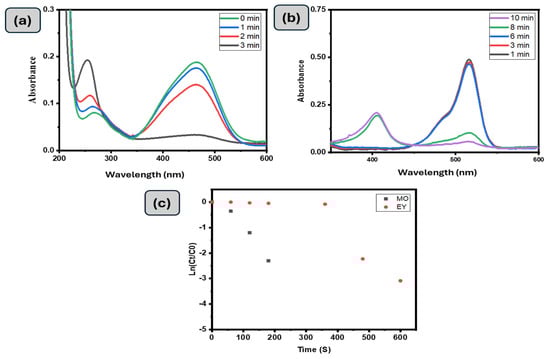 The textile, paper, and pharmaceutical industries widely use synthetic dyes. However, a significant portion of these dyes [], often more than 50%, remains unbound to textile fibers and is released into wastewater []. Among the commonly used dyes are Methyl Orange (MO), Methylene Blue (MB), and Eosin Y (EY). While MO is a representative azo dye, MB and EY belong to the thiazine and xanthene dye classes, respectively. Despite their structural differences, these dyes share similar physicochemical characteristics: they are highly water-soluble, chemically stable, and toxic to aquatic organisms. Their presence in water bodies poses serious environmental and public health concerns. Therefore, the development of efficient and versatile removal methods capable of addressing multiple dye classes has become a critical environmental priority [,,,,].