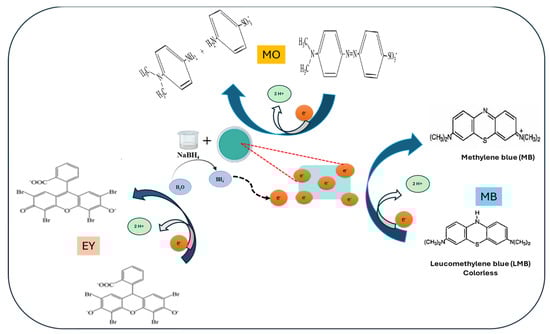 The possible mechanism for the catalytic reduction of the select dyes, Methylene Blue (MB), Methyl Orange (MO), and Eosin Yellow (EY), primarily involves nanocomposite catalyst-mediated electron transfer. Initially, the ions produced from the NaBH4 dissociate in aqueous solution. NaBH4 functions as an electron donor to produce reactive hydrogen species (BH4⁻ or H⁻), while GG-CuO-NiO enables fast electron transfer to dye molecules to speed up their reduction. In the case of MB, reversible π-π stacking interactions between the π-conjugated MB molecules and the GG-CuO-NiO hydrogel on the nanocatalyst allow them to attach to the GG-CuO-NiO hydrogel surface. The BH4⁻ ions provide the MB molecules electrons via the GG-CuO-NiO-BH4 species once both MB molecules and BH₄⁻ ions have been adsorbed on the surface. This electron transfer makes it easier for MB to be reduced into its colorless Leucomethylene Blue (LMB) form, effectively completing the reduction process. In addition, the azo (-N = N-) bond in MO undergoes cleavage to produce colorless aromatic amines. The disruption of π-conjugation in EY results in the loss of color. The catalytic properties of GG-CuO-NiO boost reaction rates, which leads to efficient and fast dye destruction, as shown in Figure 7.