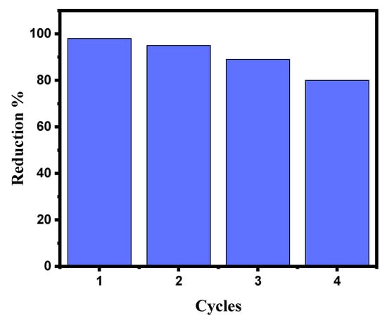 Catalytic stability is just as important as catalyst activity when assessing the catalyst’s effectiveness and its uses. To reduce MB, the stability of the GG-CuO-NiO hydrogel was examined. According to the results, the GG-CuO-NiO hydrogel could be recycled up to three times in the same way as the experimental section for the catalytic reduction of (0.01 mM) MB in the presence of (0.1 M) NaBH4. Before the GG-CuO-NiO hydrogel was assessed for the third cycle, it was cleaned three times with distilled water after each use. As seen in Figure 8, the catalytic reduction for the first use of (0.01 mM) MB took 1 min, while the subsequent uses took 2.5, 4, and 6 min the second, third, and fourth times, respectively. This suggests that the catalyst was still actively and successfully decreasing MB. As a result, up to fourth cycle of activation, the GG-CuO-NiO hydrogel remained feasible.