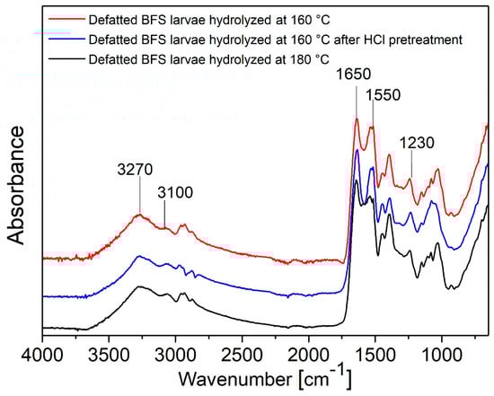 FTIR spectra of dried protein extracted from defatted BSF larvae at 160 °C, 160 °C after HCl pretreatment and 180 °C.