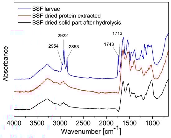 FTIR spectra of BSF larvae, BSF dried proteins extracted, BSF dried solid part after hydrolysis.
