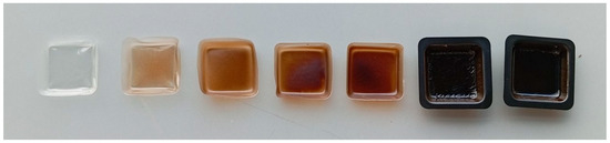 The films show visual properties influenced by their composition. They generally appear quite smooth with an even material distribution. However, in samples with a high concentration of protein, surface irregularities emerge. Regarding coloration, films with a higher percentage of PVA appear more transparent, while those with a high protein composition are more opaque and brownish in color (see Figure 4).