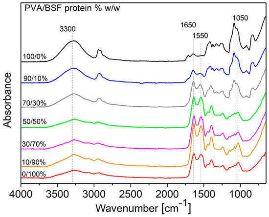 In films composed exclusively of PVA, the band located at about 3300 cm−1 appears broad and intense, highlighting intra- and intermolecular hydrogen bonds between the O-H groups of PVA. By increasing the protein concentration, this band broadens and reduces its intensity. Finally, in samples with low PVA amounts, the band becomes less defined, indicating the predominance of N-H stretching from BSF proteins.