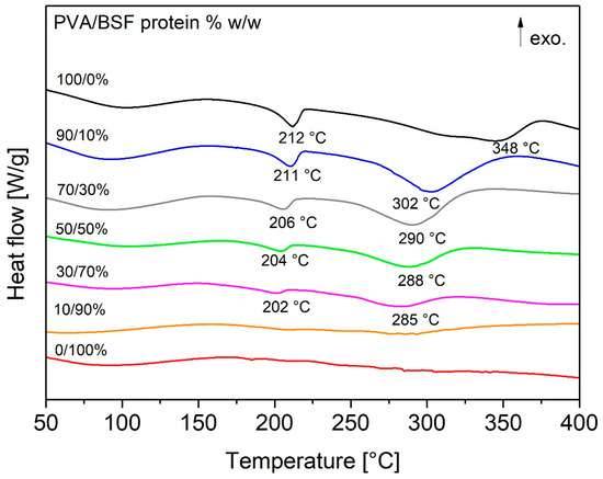 The DSC curves of the films at different percentages of PVA/BSF protein (see Figure 6) show a first endothermic peak of around 80 °C attributable to water evaporation and a second endothermic peak at around 212 °C for pure PVA, representing the melting point of the crystalline regions of PVA [51,52].