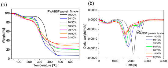 Finally, from the DTG (Derivative Thermogravimetry) curves, the peak temperature represents when the material decomposes at the maximum rate. In the pure protein sample, the DTG peak occurs at 280.8 °C, corresponding to the degradation of polypeptide chains [53]. As PVA increases in films, an increasingly pronounced shift of the peak toward higher temperatures is observed until it reaches 360.4 °C with pure PVA, confirming the stabilizing PVA impact.