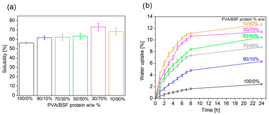 Analysis of water uptake curves (see Figure 8b) shows a significant increase in water uptake in the first eight hours for all the PVA/BSF protein films analyzed, followed by a gradual slowdown leading to a plateau within 24 h.
