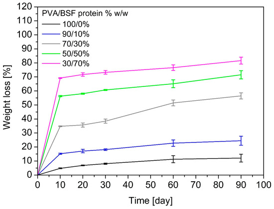 The curves show that samples with a higher protein content degrade more rapidly, while films with a higher percentage of PVA are more resistant to soil degradation. The degradation is generally characterized by a rapid initial mass loss, followed by a gradual slowdown. The pure PVA film shows a weight loss of 12% w/w after 90 days, confirming poor biodegradability in the soil, as confirmed by other authors [57], because few microorganisms present in the soil can biodegrade PVA [58]. As the percentage of protein increases, the sample weight loss increases until 80% w/w after 90 days of soil burial for the 30/70% w/w PVA/BSF protein sample. Lowering and disappearance of the Amide I (1650 cm−1) and Amide II (1550 cm−1) absorption peaks in FTIR spectra of biodegraded films highlight that the proteins are degraded in soil faster than PVA. This behaviour of rapid protein degradation in soil is confirmed by Dani et al. [59].