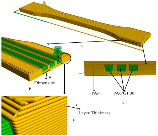 (a) Top view showing the specimen’s placement on the 3D printer’s build plate during slicing; (b) cross-sectional view along the print path illustrating the geometric dimension (A) of the embedded PA6GF30 reinforcement within the PA6 matrix; (c) vertical cross-section perpendicular to the layer deposition direction showing the layered structure and dual-material configuration (yellow: pure PA6; green: PA6GF30); (d) detail showing the defined layer thickness (B) between successive deposited lines.
