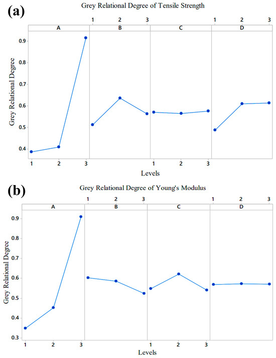 (a) The grey relational degrees of the factors for the tensile strength value; (b) the grey relational degrees of the factors for Young’s modulus values of the PA6/PA6GF30 composites.