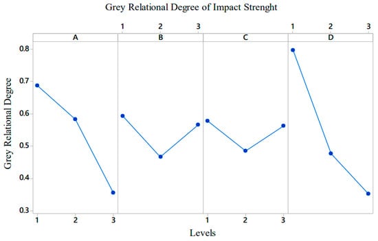 In the third stage, the grey relational degrees of the levels of each factor were calculated for the impact strength value of the PA6/PA6GF30 composites. The graph shows that the most effective factor in terms of impact resistance was D (i.e., heat treatment) and the second most effective factor was A (i.e., geometric shape measurement). The effects of factors B and C were similar. The optimal parameters in terms of the impact resistance were A1B1C1D1. As such, increasing the size of the geometric structure with the PA6GF30 material placed in pure PA6 reduced the impact resistance. The grey relational degrees of the factors for the impact value are given in Figure 4.
