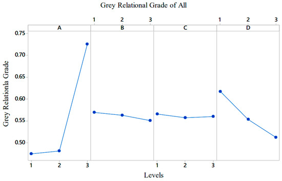 In this study, both tensile strength and impact strength were selected as performance metrics. If evaluated separately, these outputs would yield different optimal conditions. However, when GRA was applied, the normalized values for each output were combined into a single GRG, which reflected the overall performance considering all the selected outputs equally. In the last stage, the values were calculated based on all output values according to the general GRG value. Here, the weights of each output value were considered equal. The output values could be weighed according to the area where the material combination was used. The GRG values were calculated according to the factor levels and are plotted in Figure 5, which shows that factor A was the most effective factor. Factor D came second, factor C came third, and factor B came fourth. When the factors and their levels were evaluated for the optimal selection of the production parameters, it was seen that the A3B1C1D1 or C factor could be A3B1C2D1 or A3B1C3D1 due to its low effect value. Therefore, the A3B1C2D1 parameter combination represented the optimal condition when the tensile and impact strengths were considered together, not just the one with the highest individual grey relational degree (GRD) for a single output.