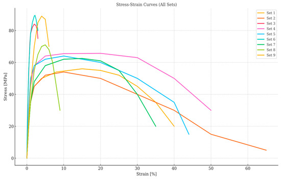 The impact strength test results and SEM images of the comparison of the PA6/PA6GF30 composites are given in Figure 6. In addition, the tensile stress–strain curves of the PA6/PA6GF30 composites are given in Figure 7. According to the pure PA6 filament’s datasheet, the impact strength value of the sample was 28 kJ/m2, the tensile strength was 61.40 MPa, and Young’s modulus value was 2419 MPa. In the experimental sequence, the seventh experiment met these conditions, and the optimal values were obtained from the experiments. The mechanical properties of the PA6/PA6GF30 composites produced under these conditions comprised an impact strength value of 35.27 kJ/m2, a tensile strength of 84.98 MPa, and Young’s modulus value of 5082 MPa. Essawi et al. [50] reported that in a 3D-printed continuous carbon fiber-reinforced nylon composite, the optimum values for the filler density, fiber angle, and carbon fiber layer position were expected to have the highest overall ratio and, therefore, the best overall value instead of the maximum value for all parameters. As a result, increasing the dimensions of the special geometric PA6GF30 structure was the most effective parameter change for increasing the tensile strength and Young’s modulus value. The experimental test results show that the mechanical properties of the pure PA6 and PA6GF30 samples in the tensile force direction were improved in the PA6/PA6GF30 composite design.