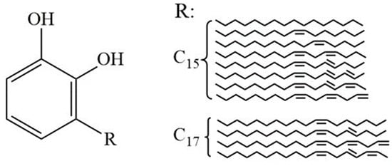 - Yeon, J.H.; Lee, T.H.; Lee, H.J.; Cho, J.-Y.; Moon, J.-H. Ionization Neutralizes the Allergy-Inducing Property of 3-Pentadecylcatechol: A Urushiol Derivative. J. Med. Food 2020, 23, 793–801. [Google Scholar]