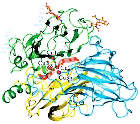 Structurally, laccase (Figure 2) coordinates four copper ions through three distinct binding motifs: the Type I (T1) copper (green region) features a distorted tetrahedral geometry with two histidine imidazoles, a cysteine thiolate, and a methionine thioether, conferring intense blue absorption (ε614 ≈ 5000 M−1cm−1) and enabling direct substrate oxidation via outer-sphere electron transfer. The trinuclear T2/T3 cluster (yellow/blue regions) consists of a mononuclear Type II (T2) copper in square planar H2O/His coordination and a binuclear Type III (T3) site bridged by a hydroxyl group, forming an antiferromagnetically coupled (J ≈ −150 cm−1) oxygen-binding pocket [18].