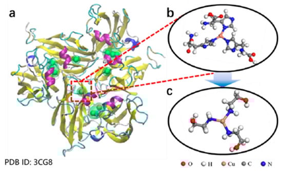 (a) Structure of laccase. (b) Enlarged view of the structure of copper active centers. (c) Schematic diagram of Cu-ethanolamine nanozyme structure [39].