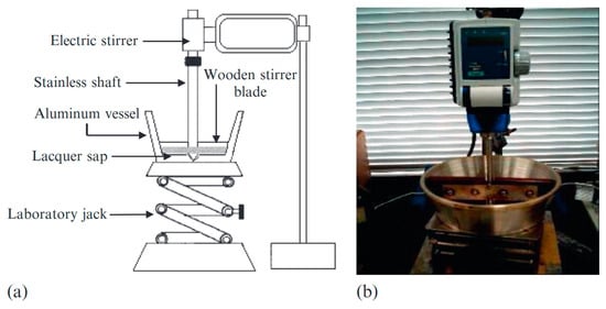 To accelerate the enzymatic polymerization of raw lacquer sap, researchers developed a small kneading mixer (Figure 5). This device allows for the repeated kneading and stirring of the lacquer sap, a process known as “kurome” in Japanese. Through repeated kneading, the transformation of lacquer monomers into dimers, trimers, tetramers, and other oligomers and polymers is effectively promoted [44].