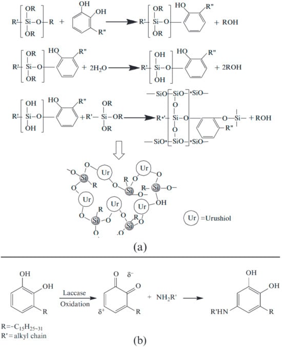 Considering that organosilicon compounds containing chlorine or thiol (–SH) groups may inhibit laccase activity, various silanes free of chlorine or thiol residues were selected for hybrid lacquer preparation. Furthermore, the reaction mechanisms between urushiol and organosilane were investigated [46].