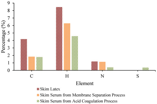 In this research, the components of C, H, N, and S were analyzed using CHNS Analysis. All the details about the quantitative results of carbon, hydrogen, nitrogen, and sulphur in skim latex and skim serum are presented in Figure 1. In skim latex, the percentage of nitrogen, carbon, and hydrogen is 1.173%, 4.175%, and 8.46%, respectively. However, in skim serum obtained from the membrane filtration process, the percentage of nitrogen, carbon, and hydrogen is 1.139%, 1.828%, and 6.286%, respectively. All the percentages of the components (C, H, and N) in skim serum are lower than in skim latex. Nevertheless, the skim serum obtained by the conventional method with the acid coagulation process using sulfuric acid has also been analyzed.