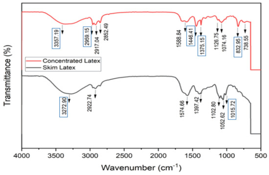 The spectra of skim latex and concentrated latex are shown in Figure 2. The skim latex and concentrated skim latex samples show peaks at 3272 cm−1 and 3357 cm−1, respectively. Near the standard latex peaks, a strong wide band ranging from 3200 to 3500 cm−1 suggests the existence of hydroxyl groups. The main peaks representing the functional groups of isoprene in natural rubber are detected at the following wavenumbers: 3033, 2961, 2927, 2855, 1664, 1450, 1375, and 837 cm−1. Apart from isoprene, other peaks indicate the presence of oxygenated compounds, such as an amide peak at 3280 cm−1, a tiny amide peak at 1548 cm−1, and a series of peaks between 1130 and 1010 cm−1 [4]. The peak at around 1080 cm−1 is attributed to the C–O group [52]. The wave values 1647, 1540, 1447, and 1357 cm−1 correspond to the peaks associated with the presence of foulant amino acids and amine from rubber protein [53].