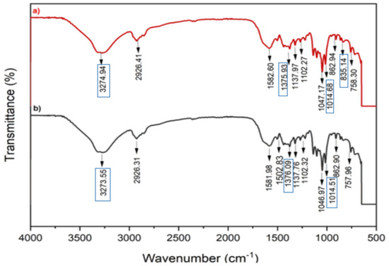The spectra of skim serum and concentrated skim latex are shown in Figure 3. Skim serum FTIR spectra show the peaks at 3273.55, 2926.39, 1581.98, 1502.82, 1376.09, 1322.16, 1268.19, 1220.66, 1137.76, 1102.32, 1045.97, 1014.51, 908.76, 862.90, 757.96, and 654.55 cm−1. However, concentrated skim latex has principal peaks at 3275.29, 2925.77, 1581.96, 1375.79, 1321.85, 1136.82, 1101.65, 1047.52, 1014.78, 908.17, and 757.46 cm−1.