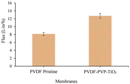 As presented in Figure 4, in comparison to the PVDF pristine membranes, the PVDF–PVP-TiO2 mixed-matrix membrane produced the highest skim serum flux (12.72 L/m2h) while the PVDF pristine membrane exhibited a lower flux of 8.14 L/m2h. The skim latex ultrafiltration process took two hours, with 1 bar trans membrane pressure, and the permeate was collected every 15 min for one hour.