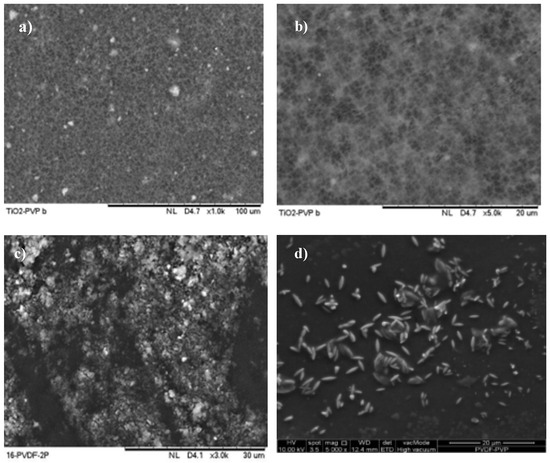 This study used a PVDF-PVP-TiO2 mixed-matrix membrane with a 16% wt PVDF concentration. As presented in Figure 5a,b, before filtration, the created membrane exhibited a smooth surface devoid of any deposition of materials. Pores with interconnected structures were identified on the surface of all membranes at a magnification of 1.00 and 5.00 k×. According to Teow et al. [62], it can be inferred that the selection of TiO2 nanoparticles does not substantially influence the alteration of membrane shape. The membrane was modified by including TiO2 nanoparticles, leading to the observable arrangement of TiO2 on the membrane’s surface. The appearance of these nanoparticles can vary, either as small, uniformly distributed particles or as clusters, contingent upon the synthesis technique employed and how TiO2 is distributed within the membrane.