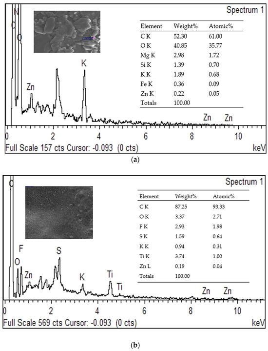 EDX of (a) concentrated latex (retentate); (b) PVDF-PVP-TiO2 membrane after filtration process.