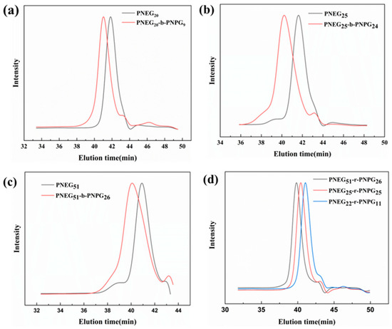 GPC characterization: (a–c) comparison of GPC traces of one-block polypeptoids and two-block polypeptoids; (d) GPC traces of PNEG-r-PNPG random copolypeptoids with different DPs.
