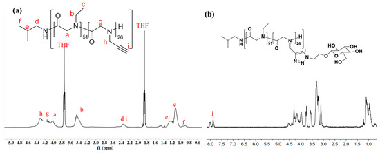 1H NMR spectra of (a) PNEG51-r-PNPG26 (400 MHz; CDCl3) and (b) corresponding glycopolypeptoids (PE51-r-(PG-e-Glu)26 (400 MHz; D2O)).