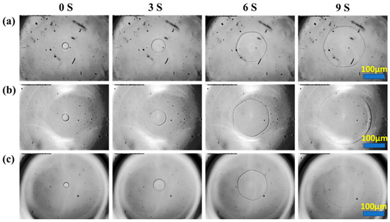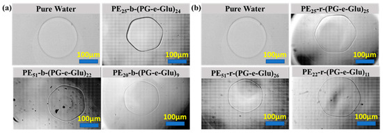 The prepared glycopolypeptoids were dissolved in pure water at varying concentrations to conduct the nanoliter osmometer experiment. This test allowed for the observation of the ice crystal morphology and the growth process of a single ice crystal under different subcooling temperatures (ΔT). Thermal hysteresis (TH) is the difference between the equilibrium melting and freezing temperatures of ice crystals, which is not desirable for antifreeze agents used in cryopreservation [43,44]. It was noticed that TH was not observed for all glycopolypeptoid samples, which suggested that glycopolypeptoids could be an effective antifreeze agent in cryopreservation. In pure water, the ice crystal exhibited a flat disc shape. However, the presence of glycopolypeptoids consistently altered the morphology to a hexagonal shape, regardless of the main-chain sequence, molecular weight, or the ratio of hydrophobic-to-hydrophilic units (Figure 3).