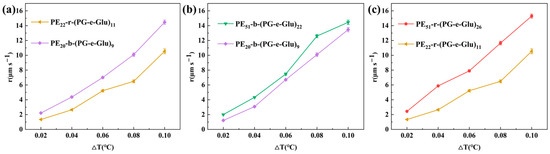 The effects of glycopolypeptoid structures on ice crystal growth rate under different supercooling temperatures (at a concentration of 2 mg mL−1): (a) samples PE22-r-(PG-e-Glu)11 and PE20-b-(PG-e-Glu)9; (b) samples PE51-b-(PG-e-Glu)22 and PE20-b-(PG-e-Glu)9; (c) samples PE51-r-(PG-e-Glu)26 and PE22-r-(PG-e-Glu)11.