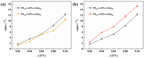 The effects of glycopolypeptoid hydrophobic and hydrophilic units on the ice crystal growth rate under different supercooling temperatures at a concentration of 2 mg mL−1: (a) samples PE25-r-(PG-e-Glu)25 and PE22-r-(PG-e-Glu)11; (b) samples PE25-r-(PG-e-Glu)25 and PE51-r-(PG-e-Glu)26.
