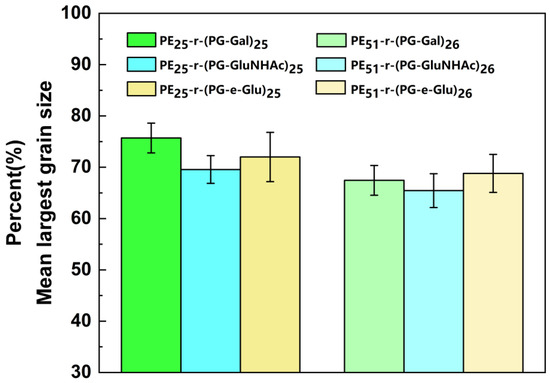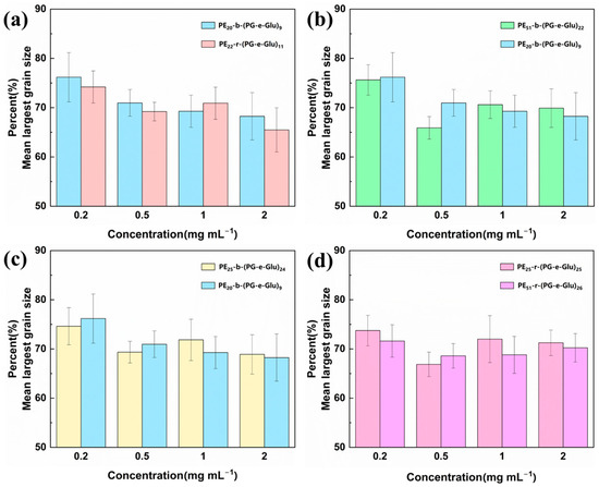 The MLGS percentages of samples with different concentrations were measured to investigate the effects of glycopolypeptoid main-chain structures and degrees of polymerization on IRI activity. Generally, when the MLGS or MLGS percentage is smaller, IRI activity is better. As shown in Figure 9, overall, the MLGS percentages decreased with an increase in the glycopolypeptoid concentration. PE22-r-(PG-e-Glu)11 at a concentration of 2 mg mL−1 had the best IRI activity and the MLGS percentage was reduced to 64.8 ± 4.4%. These results indicated that the IRI activity of glycopolypeptoids was positively correlated with the concentration. The effects of the unit sequence, degree of polymerization, and unit composition on IRI activity (Figure 9) were also studied. No obvious differences or trends were observed, suggesting all glycopolypeptoids had comparable IRI activity.