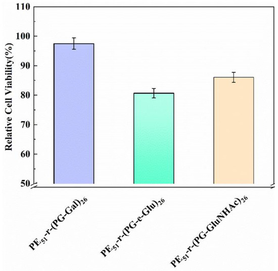 In order to verify the safety of the synthesized glycopolypeptoids, the three above-mentioned random glycopolypeptoids were selected for cytotoxicity experiments. As shown in Figure 12, the relative cell viabilities of PE51-r-(PG-Gal)26, PE51-r-(PG-e-Glu)26, and PE51-r-(PG-e-GluNHAc)26 were 97.5%, 80.7%, and 86.1%, respectively. These glycopolypeptoids could be considered to be non-cytotoxic because all the relative cell viabilities were above 75% [45], confirming their potential utilization as biomedical materials.