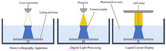 Photopolymerization techniques, including stereolithography (SLA) and digital light processing (DLP), fabricate components by layerwise curing of liquid photopolymer resins under ultraviolet (UV) light [49,51], as shown in Figure 3. Compared to FDM, integrating continuous fibers into photopolymerization processes presents greater complexity due to challenges in precise fiber alignment caused by the liquid-state resin properties [78].