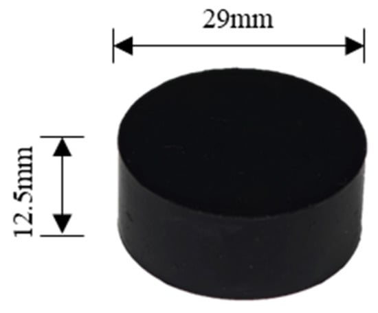 The EPDM rubber used in this study was prepared based on the formulation proposed by Huang [47], and the main components are listed in Table 1. All ingredients used in the formulation were of industrial grade and commercially available. The preparation process is as follows: EPDM, organo-modified montmorillonite (OMMT), and the compatibilizer EPDM-g-MAH were melt-compounded at 110 rpm, 90 °C for 15 min to achieve intercalation. Then the compound was transferred to a two-roll mill. The rolls were heated to 60 °C, and the material was passed repeatedly through a narrow roll gap to form a continuous sheet. The roll gap was widened, and the rolls were heated to 80 °C. Carbon black, ZnO, stearic acid, and antioxidants were added sequentially and uniformly mixed to obtain Compound I, which was then naturally cooled. Subsequently, the vulcanizing agent and accelerator were incorporated into Compound I to obtain Compound II. Compound II was then poured into the designed mold to form cylindrical samples for compression. The molds were placed in a compression molding machine and cured at 160 °C under 15 MPa for 1 h to obtain cylindrical specimens, as shown in Figure 1.