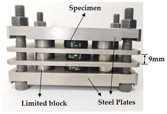 EPDM rubber products usually undergo aging in a deformed state during the service process. A pre-deformation device was applied in this study, as shown in Figure 2. The device applies compression to the EPDM sample by tightening bolts on the pressure plates, while the compression ratio is controlled using a limit block. In this setup, a limit block with a height of 9 mm was used, corresponding to a constant compression ratio of 28%. As EPDM rubber ages very slowly at room temperature, accelerated aging was performed by the pre-compressed specimens in an air-circulated oven. The oven temperature was set to 393 K. Based on the Arrhenius equation and time–temperature equivalence principles [48,49,50,51,52], the aging time at 393 K can be equivalently converted to the aging time at room temperature. The conversion equation is as follows: