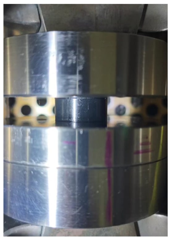 To evaluate temperature’s influence on the hyperelastic response of EPDM rubber after accelerated aging, uniaxial compression tests were carried out using a material testing machine with a temperature chamber, as shown in Figure 3. After accelerated aging, the EPDM specimens exhibited an increase in diameter, a reduction in height, uneven deformation, slightly irregular end surfaces, and minor circumferential bulging. Therefore, the dimensions of the aged specimens were remeasured, and the results are presented in Appendix A. The test temperatures in the chamber were set to 273 K, 283 K, 293 K, and 313 K.