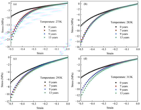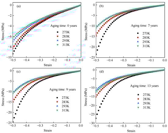 Uniaxial compressive stress–strain curves of EPDM rubber with different equivalent aging times at (a) 273 K, (b) 283 K, (c) 293 K, and (d) 313 K.