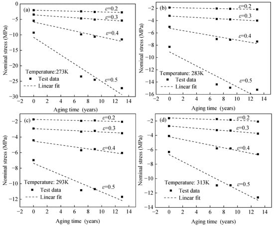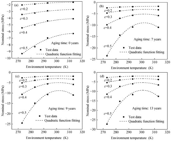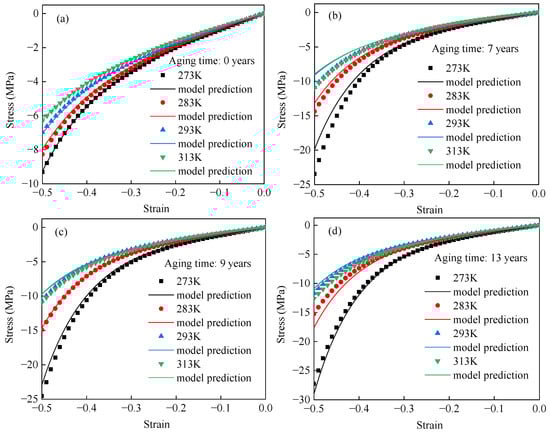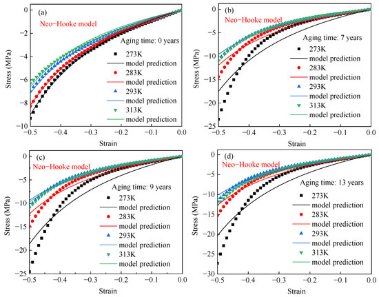 The stress–strain data of EPDM rubber aged for (a) 0 years, (b) 7 years, (c) 9 years, and (d) 13 years at different temperatures and the fitting curves of the Neo–Hooke model.