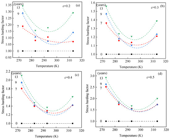 In order to analyze the effects of temperature on aging behavior, the concept of a stress hardening factor was introduced. This factor characterizes the stress hardening behavior induced by aging at a given strain, and its expression is given as follows: