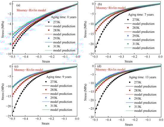 The stress–strain curves of EPDM rubber aged for (a) 0 years, (b) 7 years, (c) 9 years, and (d) 13 years at different temperatures using the Mooney–Rivlin model.