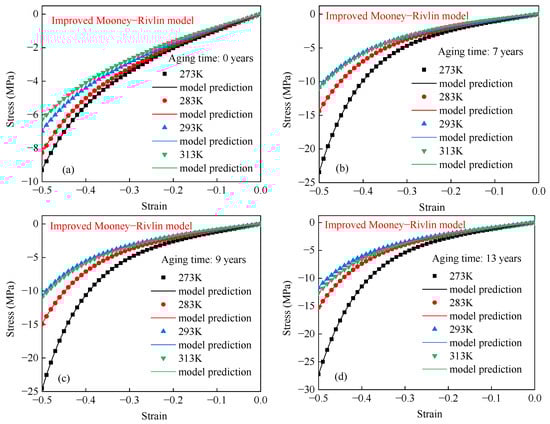 The stress–strain curves of EPDM rubber aged for (a) 0 years, (b) 7 years, (c) 9 years, and (d) 13 years at different temperatures using the improved Mooney–Rivlin model.